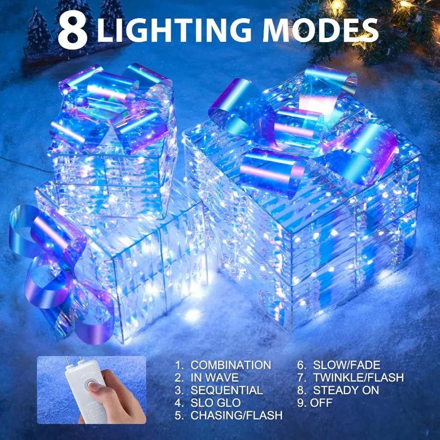 Shiny Christmas Ornaments: Our Christmas outdoor decorations is composed of 3 pack light up gift boxes of different sizes, adorned with 150 LED lights and metal frame, cover with shiny tinsel and clear bow. Whether these Christmas lighted gift boxes are placed, they definitely grab your attention. These Christmas porch decor gift boxes are great for indoor and outdoor decorations